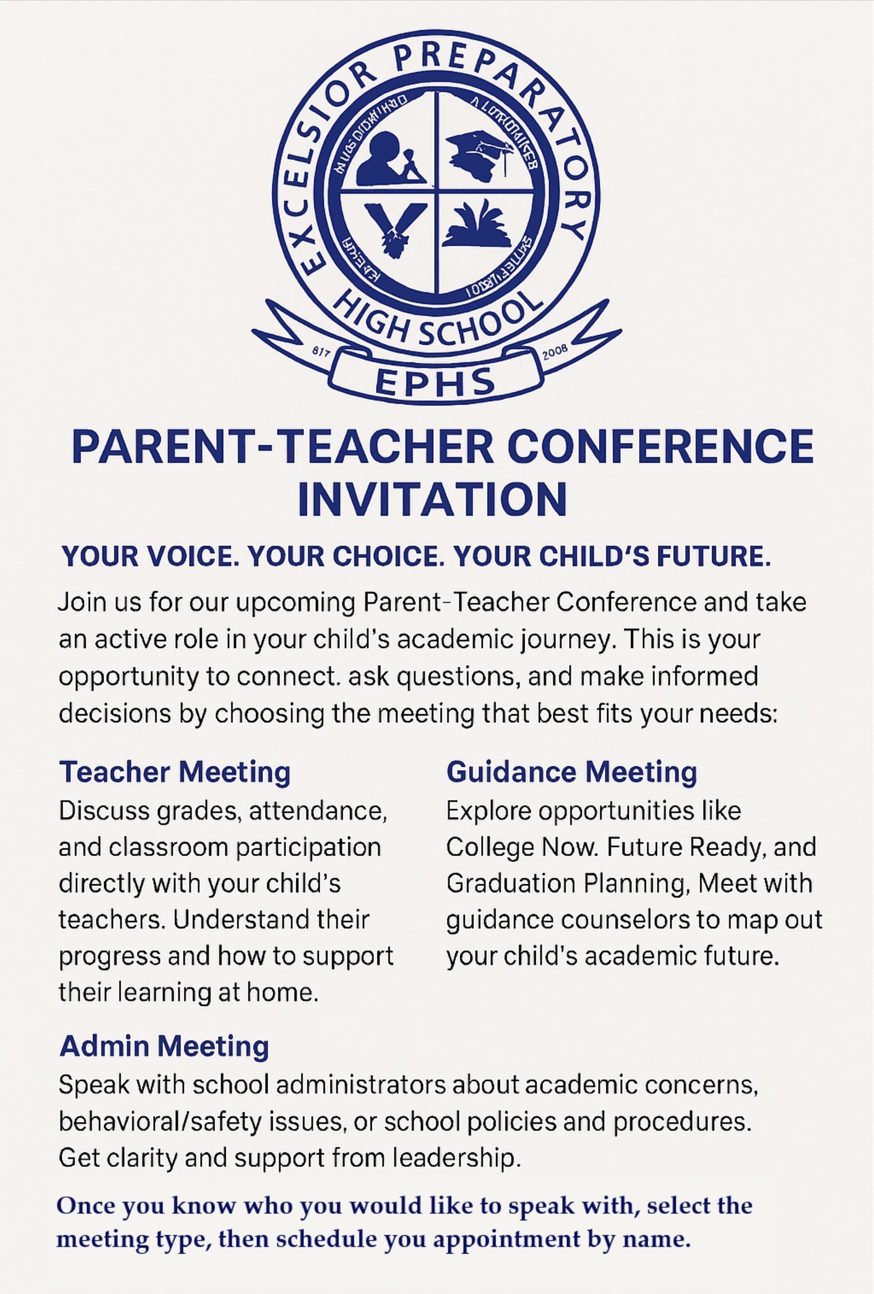 This is your opportunity to connect, ask questions, and make informed decisions by choosing the meetings that best fit your child's needs.