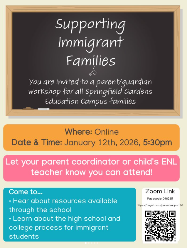 Hear from teachers, parent coordinators, the librarian, and a guest speaker from the New York State Youth Leadership Council on the resources available to immigrant students and families on our campus. Open to all families and students at Springfield Gardens Campus! Speak to your school’s parent coordinator with any questions.